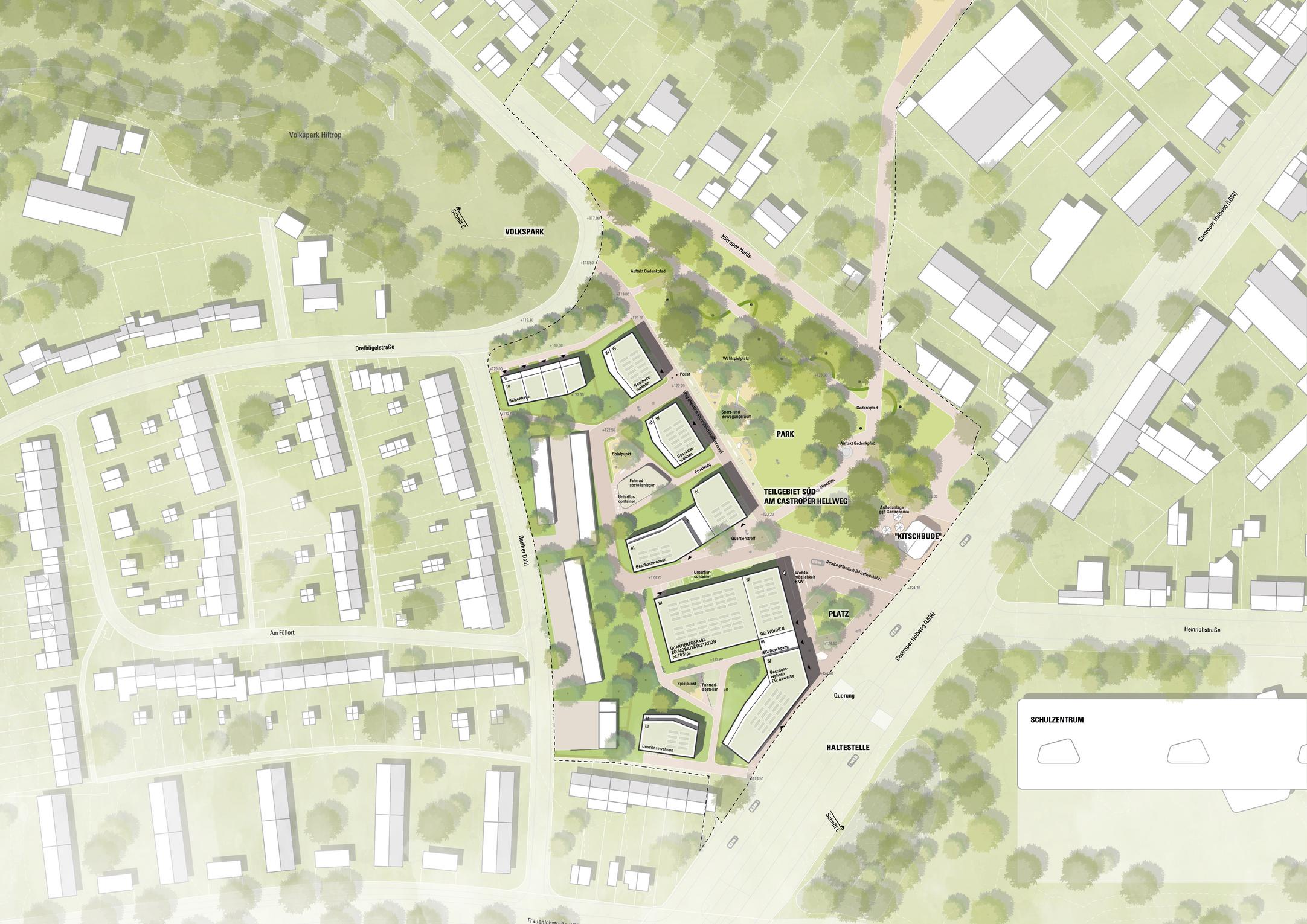 Die Fläche wird über eine Zufahrt am Castroper Hellweg gegenüber der Einmündung in die Heinrichstraße erschlossen. Am Castroper Hellweg ist eine viergeschossige Straßenrandbebauung vorgesehen. Hier können im Erdgeschoss Angebote für die tägliche Versorgung, wie ein Bäcker oder ein Kiosk, realisiert werden. An diese Bebauung schließt sich eine bis zu vier Geschosse umfassende Quartiersgarage an, in der auch eine Mobilitätsstation mit Sharing-Angeboten untergebracht werden soll. Durch die Quartiersgarage kann das Wohnquartier weitgehend autofrei gestaltet und die Gartenbereiche unversiegelt belassen werden. Die Bebauung wird in Richtung Dreihügelstraße durch mehrere Wohngebäude mit drei bis vier Geschossen fortgeführt. Die abschließende Bebauung an der Dreihügelstraße treppt sich zur Straße Gerther Dahl auf zwei Geschosse ab, so dass ein harmonischer Übergang zur dort vorhandenen Reihenhausbebauung entsteht. Schätzungsweise können so rund 67 Wohneinheiten entstehen.