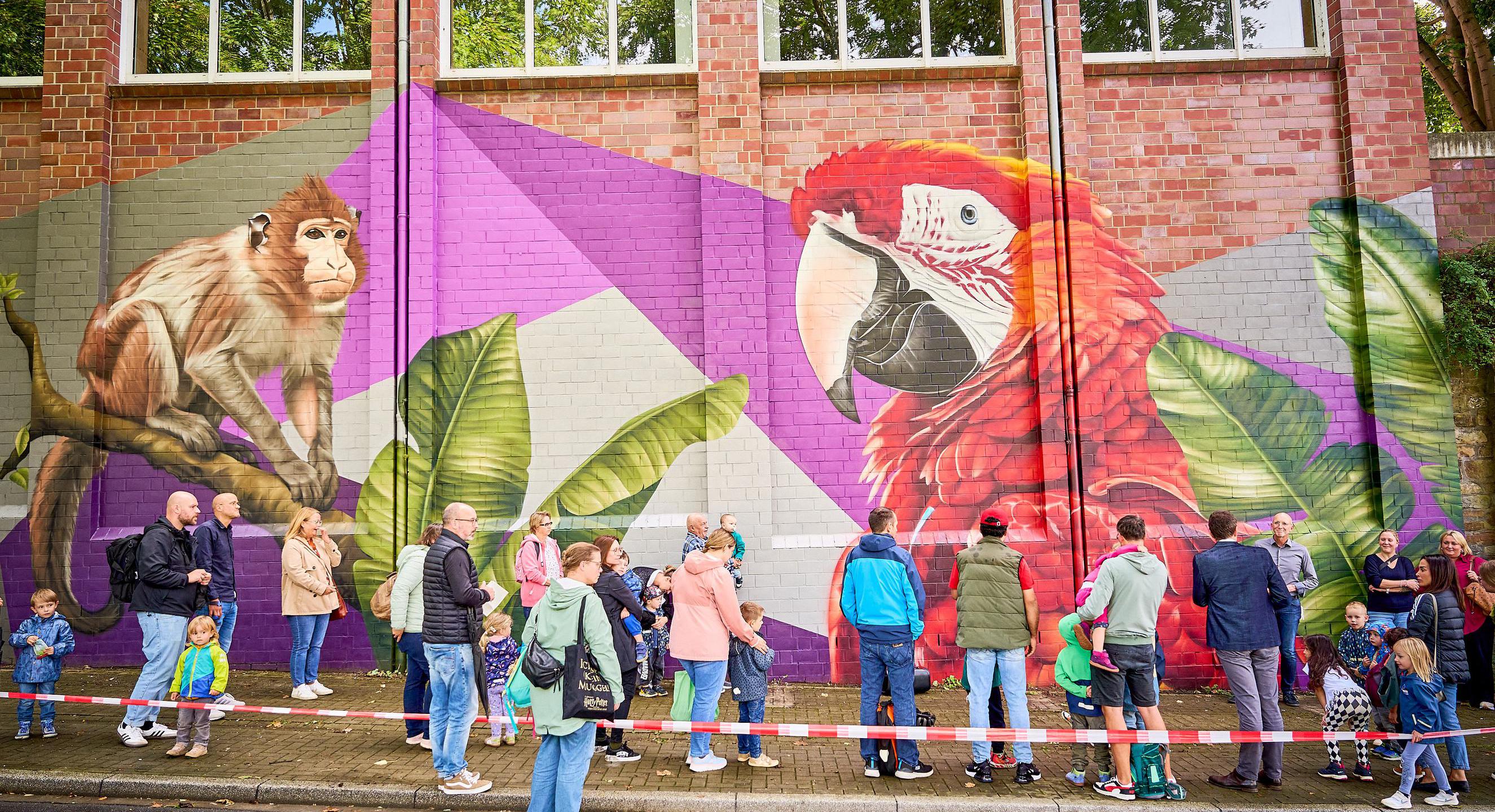 Das neue Mural in Dahlhausen besticht durch satte und leuchtende Farben. Lebensecht dargestellte Tiere - ein Panda, ein Affe und ein Ara-Papagei – zieren die Wand. Ein echter Hingucker!