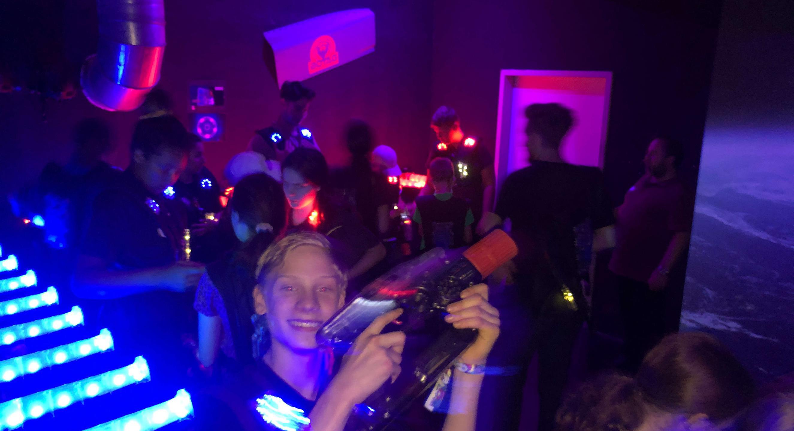 Vom JuZe aus fahren wir mit der Straßenbahn nach Riemke zum Lasertag spielen. In der gut erprobten Halle werfen wir uns die Westen über und haben dann drei Stunden Zeit zum Zocken.