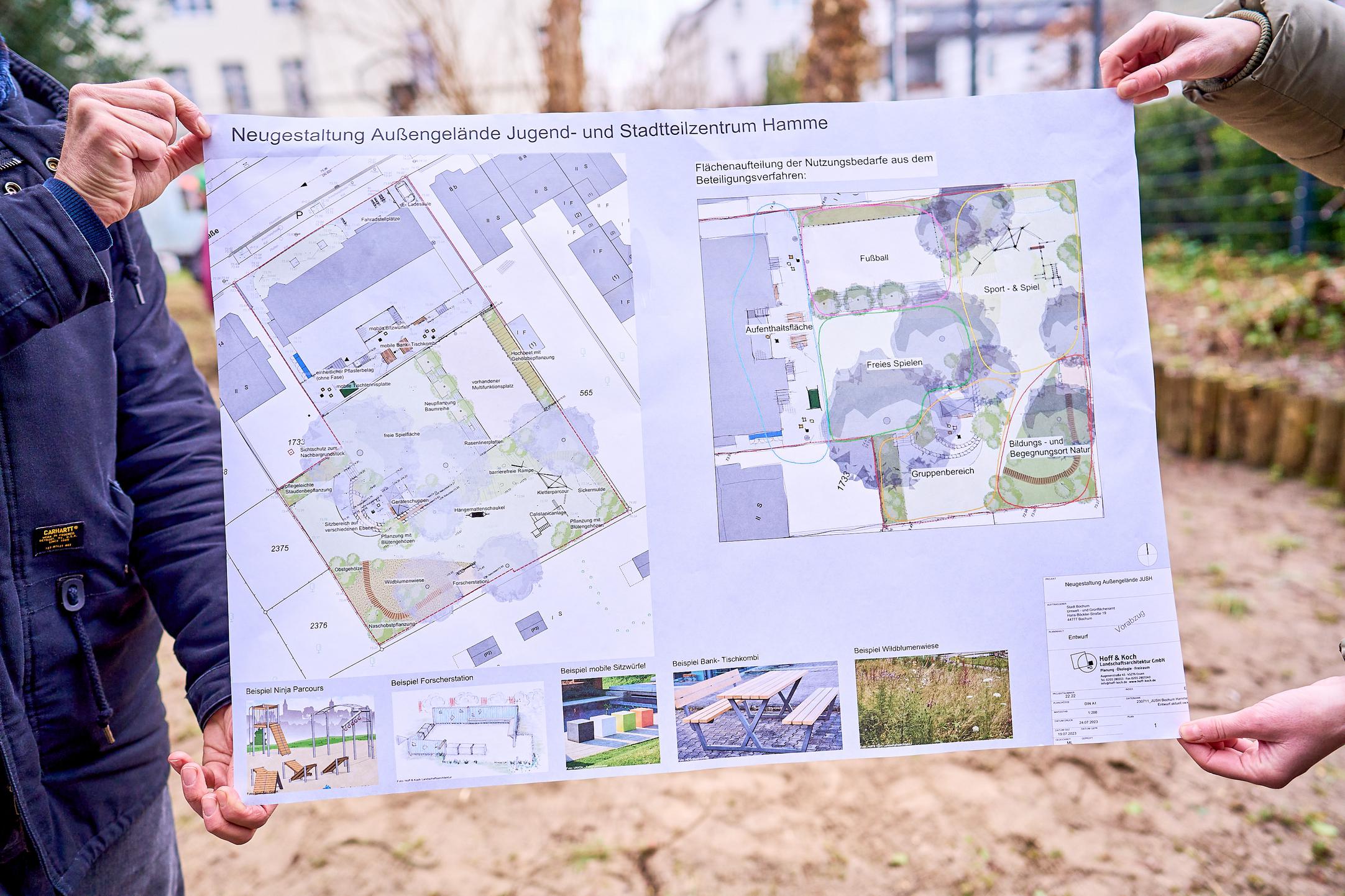 Das Jugend- und Stadtteilzentrum ist für Kinder, Jugendliche und junge Erwachsene eine wichtige Anlaufstelle. Es bietet pädagogische Angebote vom Nachmittag bis in den Abend und einen geschützten Ort für soziales Miteinander, Spiel und Sport. Die sogenannte „Bürgeretage“ steht allen Akteuren und Nutzergruppen aus dem Quartier zur Verfügung. Auch die Flüchtlingsberatung und das Seniorennetzwerk sind dort vor Ort tätig. Alle potenziellen Nutzerinnen und Nutzer waren aufgefordert, sich an der Planung zu beteiligen.