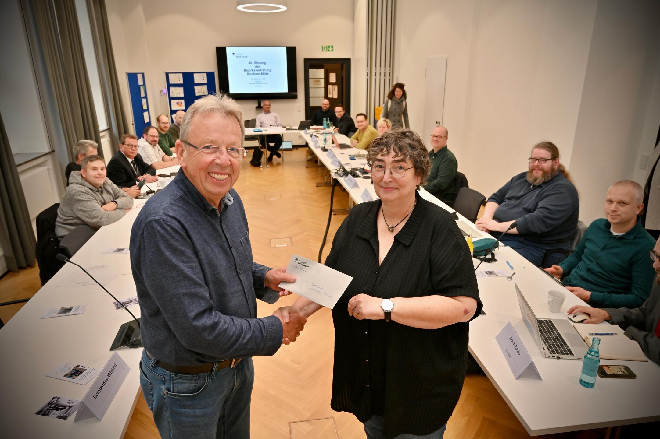 Bereits vor der Sitzung der Bezirksvertretung Mitte übergab Bezirksbürgermeisterin Gabriele Spork an den Schatzmeister des Vereins „Aufsuchende Medizinische Hilfe für Wohnungslose Bochum e.V.“, Eckhard Sundermann, eine Spende in Höhe von 1.000 Euro. Diese ist durch eine Blumenversteigerung beim Volksfest an den Grummer Teichen im vergangenen Juni zusammengekommen. Der Verein unterstützt Menschen, die aufgrund ihrer sozialen Umstände medizinische Hilfe kaum oder viel zu spät in Anspruch nehmen.