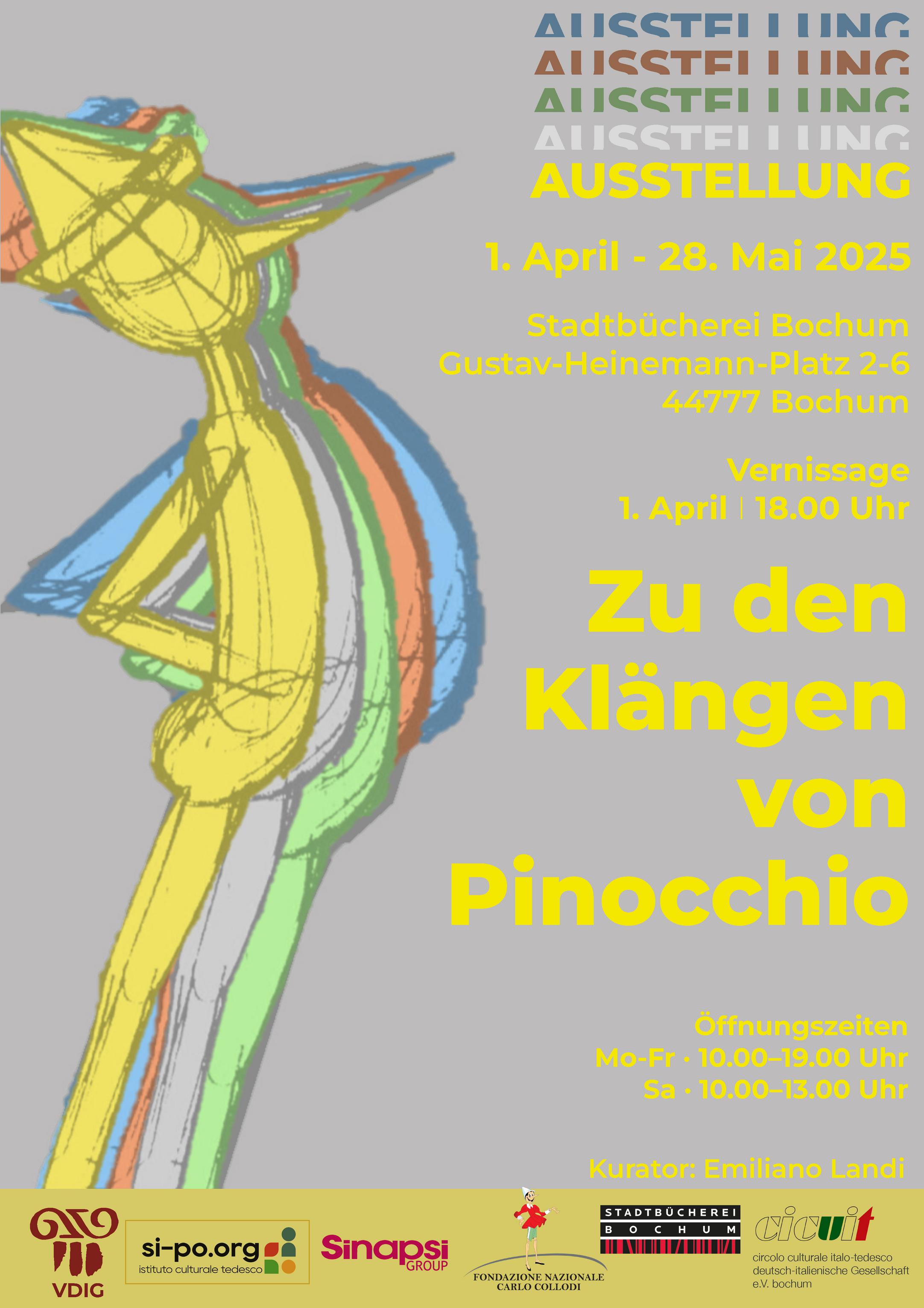 Im Obergeschoss der Stadtbücherei Bochum im Bildungs- und Verwaltungszentrum, Gustav-Heinemann-Platz 2–6, eröffnet am Dienstag, 1. April, um 18 Uhr die neue literarische Ausstellung „Zu den Klängen von Pinocchio – Sulle Note di Pinocchio“. Dabei steht die weltberühmte Märchenfigur im Mittelpunkt. Der Eintritt ist kostenfrei, eine Anmeldung nicht erforderlich. Danach ist die Ausstellung von Mittwoch, 2. April, bis Mittwoch, 28. Mai, während der Öffnungszeiten zu sehen: montags bis freitags von 10 bis 19 Uhr und samstags von 10 bis 13 Uhr. Die Ausstellung in Bochum wird vom „VDIG e.V.“ in Kooperation mit dem „cicuit – Deutsch-italienische Gesellschaft Bochum e. V.“ und der Stadtbücherei Bochum präsentiert.