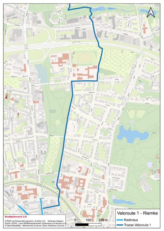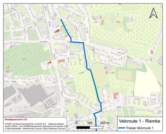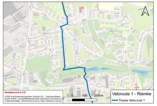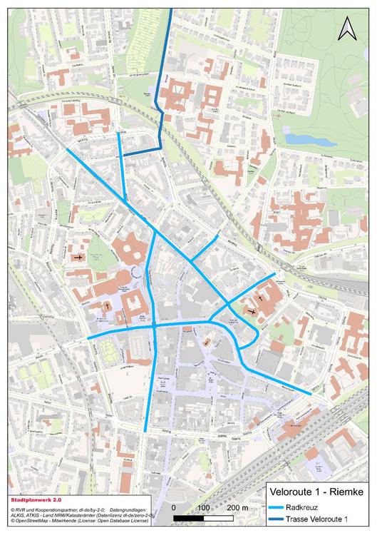 Die Veloroute 1 bildet den Startschuss für das Projekt Velorouten. Sie verbindet auf einer Länge von ca. 3,8 km ab der Widumestraße das Innenstadtzentrum (Radkreuz) mit dem nördlichen Stadtteilzentrum Riemke. Bei durchschnittlicher Fahrgeschwindigkeit von 20km/h ist mit einer reinen Fahrzeit von ca. 12 Minuten zu rechnen.