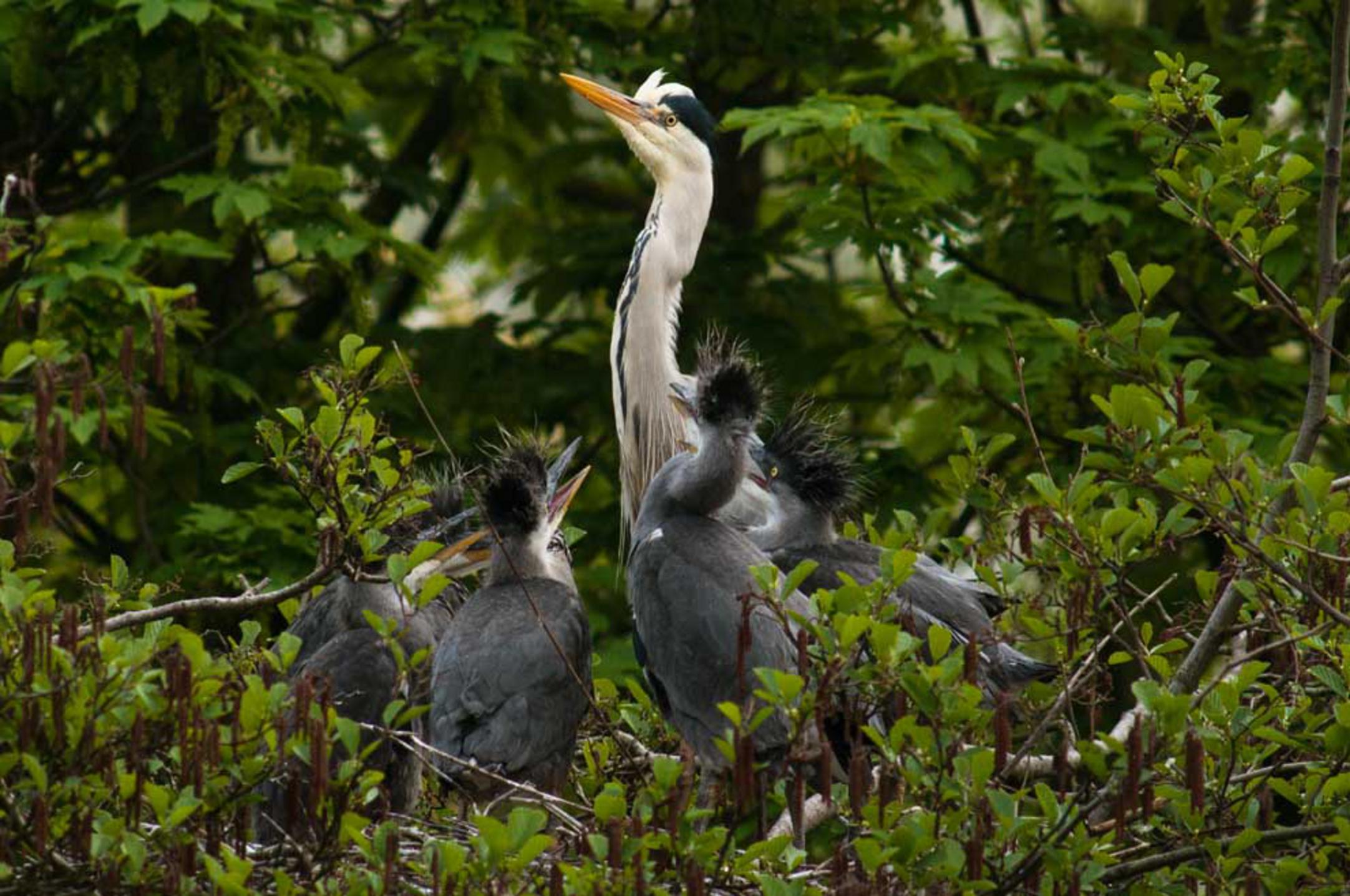 Seit Jahren ziehen hier Graureiher ihre Jungen groß. Hunde und Füchse kommen nur selten hinübergeschwommen, so dass Störungen kaum vorkommen und sich die Tiere recht sicher fühlen.