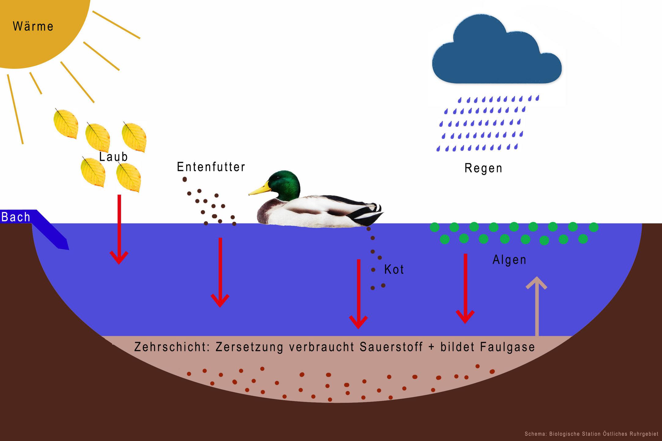 Die Nährstoffe lassen Mikroorganismen und Algen wachsen. Wenn sie später absterben und zu Boden sinken, bilden sie dort eine „Zehrschicht“. Bei der Zersetzung wird Sauerstoff verbraucht und Faulgas (Methan) produziert. Gerade an warmen Sommertagen gedeihen und zersetzen sich die Pflanzen und Bakterien bestens. Erschwerend kommt hinzu, dass sommerwarmes Wasser ohnehin weniger Sauerstoff halten kann als kaltes Wasser. So fehlt den Tieren am Grund des Sees die Luft zum Atmen: Fische schnappen dann an der Oberfläche nach Luft, vor allem wenn der See flach ist.
