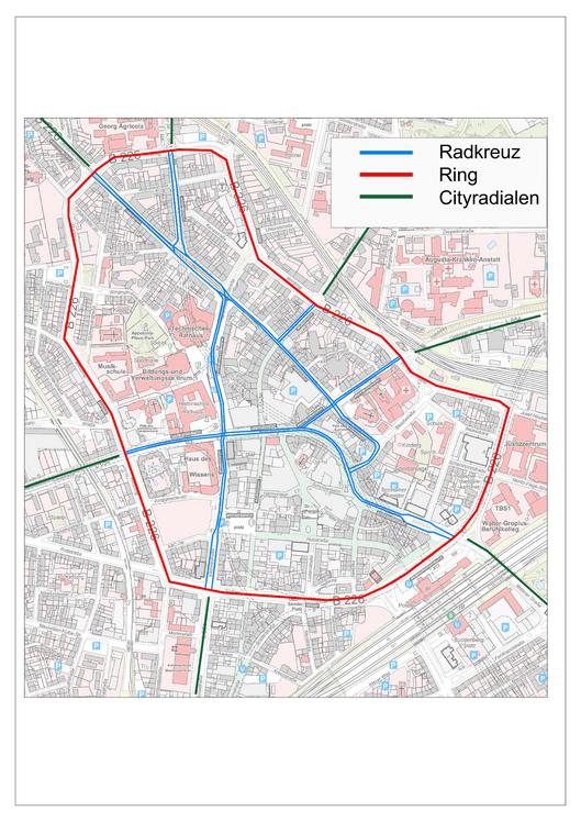 Das Radkreuz sind Radwegeverbindungen innerhalb des Innenstadtringes, die die Cityradialen und zukünftig auch die Velorouten auf kürzestem Weg verbinden.