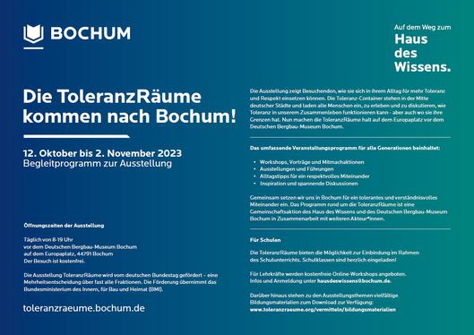 Die Podiumsdiskussion „Grenzen der Toleranz“ findet am 23. Januar 2024 um 18:30 Uhr im Deutschen Bergbau-Museum Bochum statt. Gemeinsam mit spannenden Diskussionsteilnehmenden wird das Thema Toleranz aus unterschiedlichen Blickwinkeln beleuchtet. Die Veranstaltung ist kostenlos. Es wird um eine vorherige Anmeldung bis zum 21. Januar 2024 gebeten an vhs@bochum.de. Einlass ab 18 Uhr.